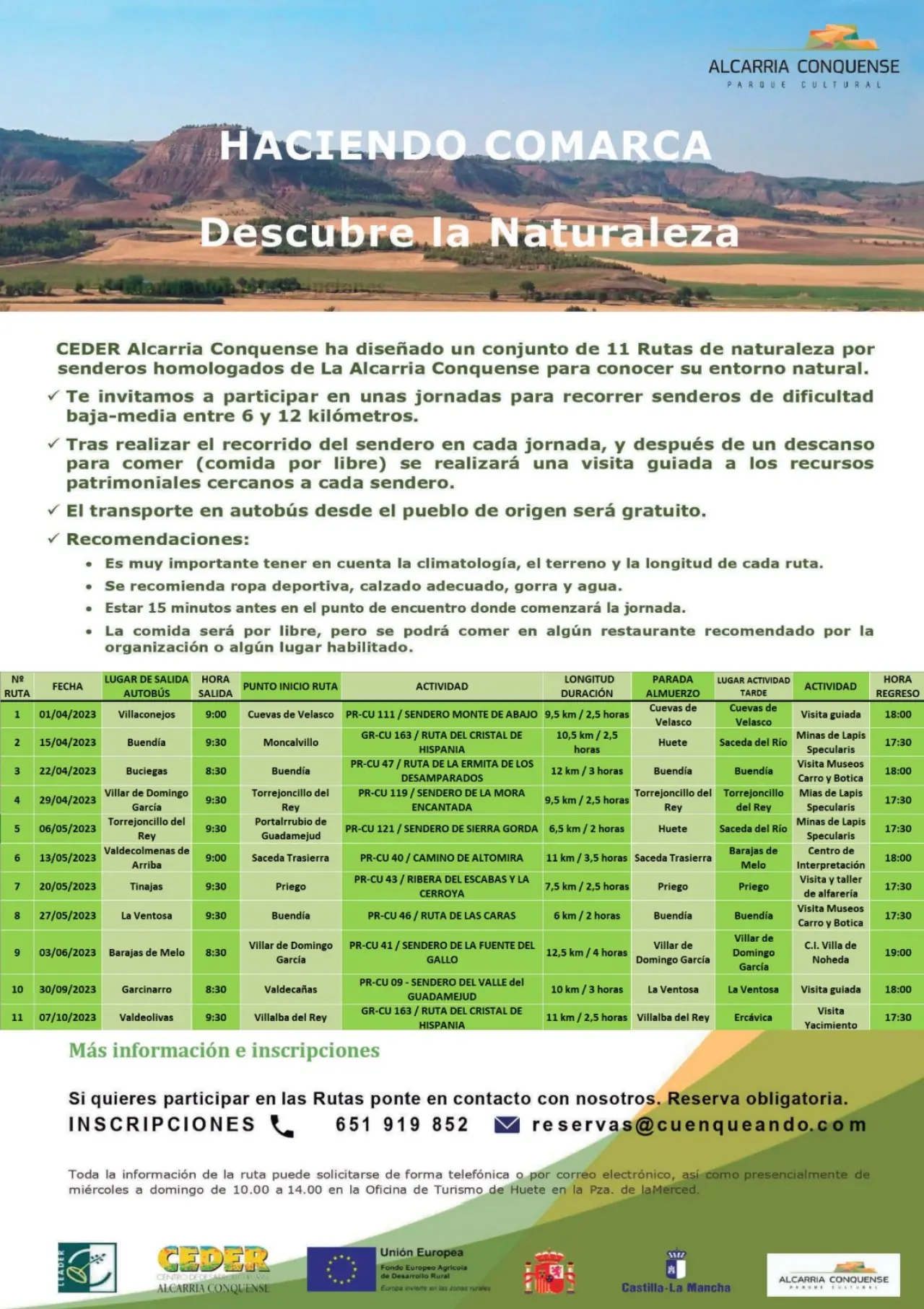 Una aventura que nos llevará a parajes únicos y pueblos con encanto y que nos hará disfrutar de todos los atractivos de una comarca, repleta de enclaves de gran contraste y belleza. Deporte, cultura, medioambiente y patrimonio se dan la mano en esta iniciativa que forma parte del proyecto “Haciendo comarca: descubre la naturaleza” con el que CEDER Alcarria Conquense pretende poner en valor la riqueza natural y patrimonial de esta comarca.