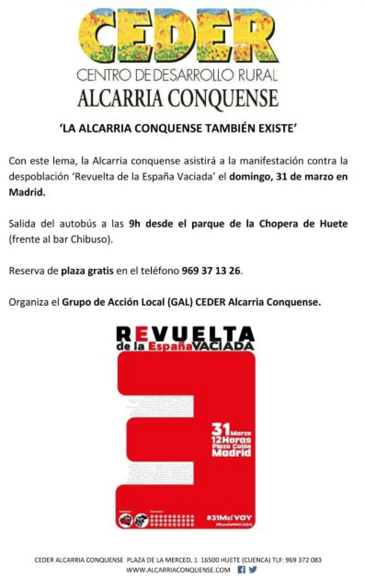 La Alcarria Conquense con el lema "LA ALCARRIA CONQUENSE TAMBIÉN EXISTE" estará representada en esta manifestación cuyos dos principales convocantes son las Plataformas Ciudadanas “Teruel Existe” y “Soria Ya”.