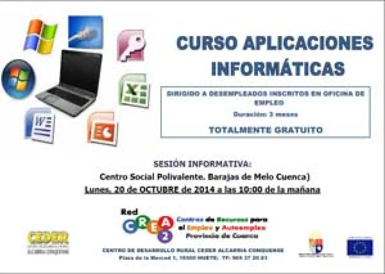 Por todo ello desde el CEDER Alcarria Conquense se ha diseñado en el marco de la Red CREA2, e impulsado por el Patronato de Desarrollo Provincial de la Diputación de Cuenca y financiado por el Fondo Social Europeo un Curso de Formación de Aplicaciones Microinformáticas.