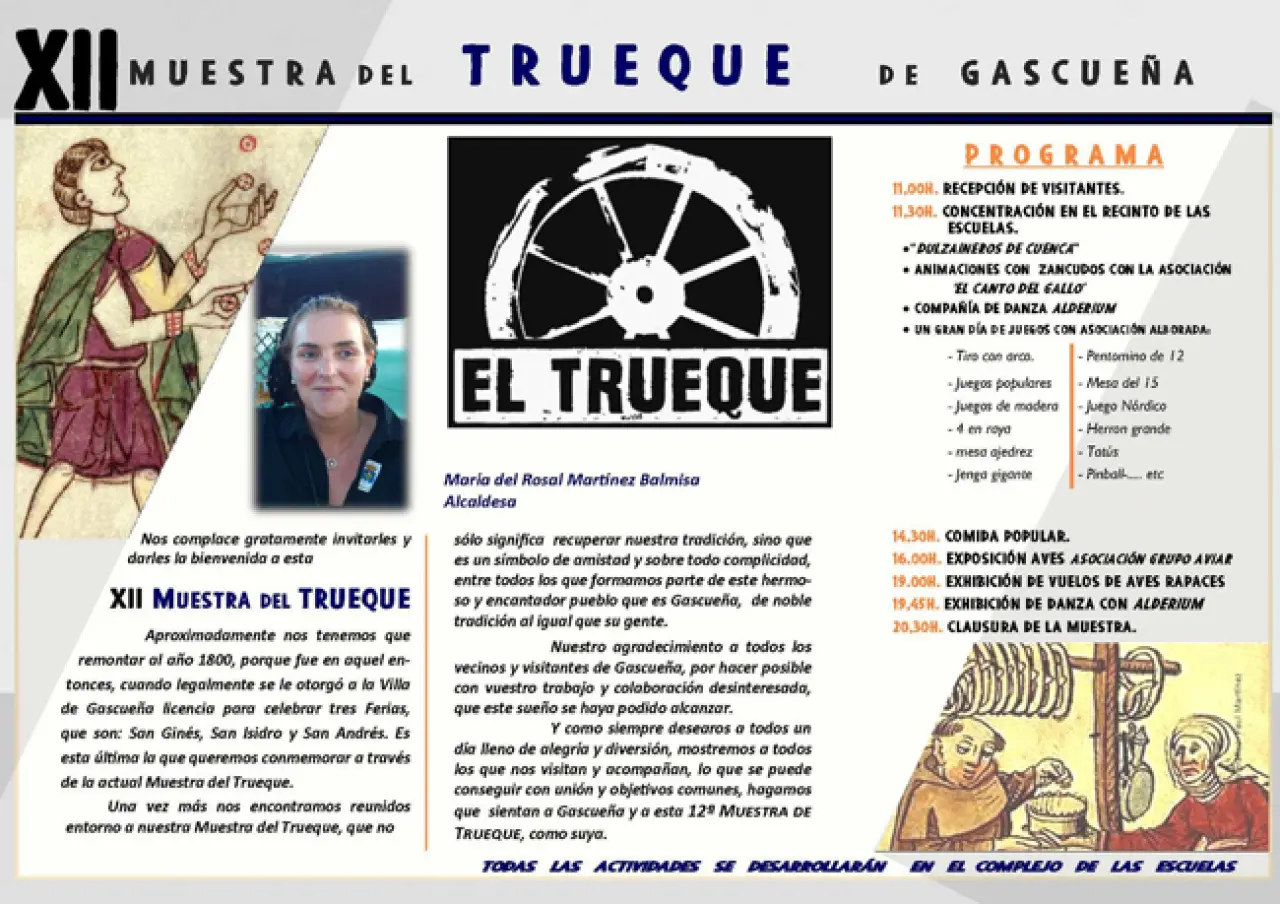 El sábado, 6 de octubre, el pueblo de Gascueña organiza su ya tradicional Muestra del Trueque, que alcanza su XII edición con la misma implicación y participación por parte de la población, según su alcaldesa, María del Rosal Martínez Balmisa. Desde que en 2007 un grupo de vecinos decidió resucitar por un día esta técnica comercial de intercambio de productos sin que entre en juego el dinero, organizado ya por el Ayuntamiento —con la colaboración de todas las asociaciones de la localidad y el apoyo de la Diputación de Cuenca— cada año reciben mayor número de asistentes de dentro y fuera de la Alcarria conquense.
