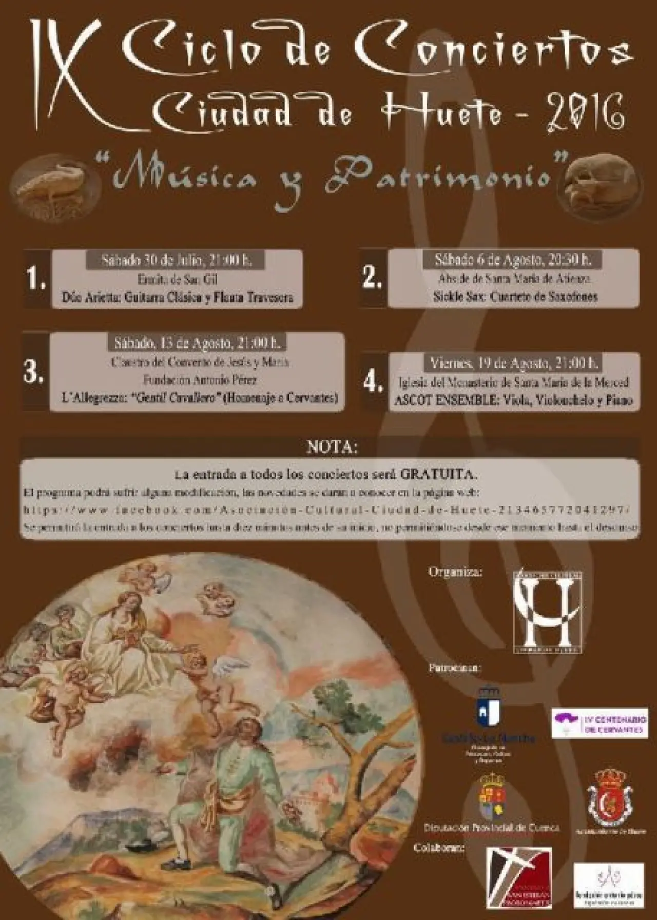 La Asociación Cultural Ciudad de Huete organiza el IX Ciclo de Conciertos “Música y Patrimonio”, con un total de 4 conciertos entre los meses de julio y agosto, en diferentes monumentos de la ciudad.