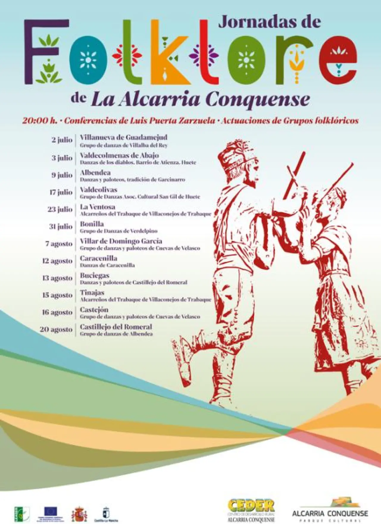 Entre el 2 de julio y el 12 de agosto se celebrarán en 11 pueblos de la comarca las Jornadas de Folklore de La Alcarria Conquense, un proyecto de promoción comarcal organizado por el Grupo de Acción Local (GAL) CEDER Alcarria Conquense en colaboración con ayuntamientos y Grupos de Folklore para difundir y contribuir a preservar, consolidad y revitalizar esta manifestación cultural que forma parte del patrimonio inmaterial de La Alcarria Conquense. Asimismo, se pretende sensibilizar sobre los recursos endógenos y tradiciones de la comarca, crear identidad comarcal a través del conocimiento de una de sus manifestaciones culturales y colaborar con otros actores locales para difundir las posibilidades turísticas y características culturales que favorezcan el desarrollo integral del territorio.